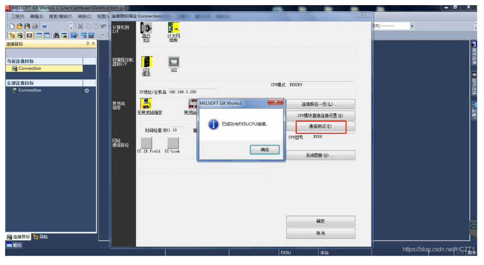 點(diǎn)擊【通信測試】,提示“已成功與FX5UCPU連接”。