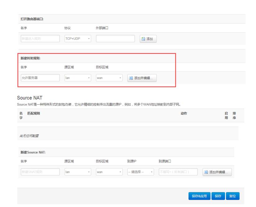 五、 在“新增轉(zhuǎn)發(fā)規(guī)則”處添加規(guī)則名稱,規(guī)則名稱為 “允許服務(wù)器”,并點(diǎn)擊添加并編輯按鈕
