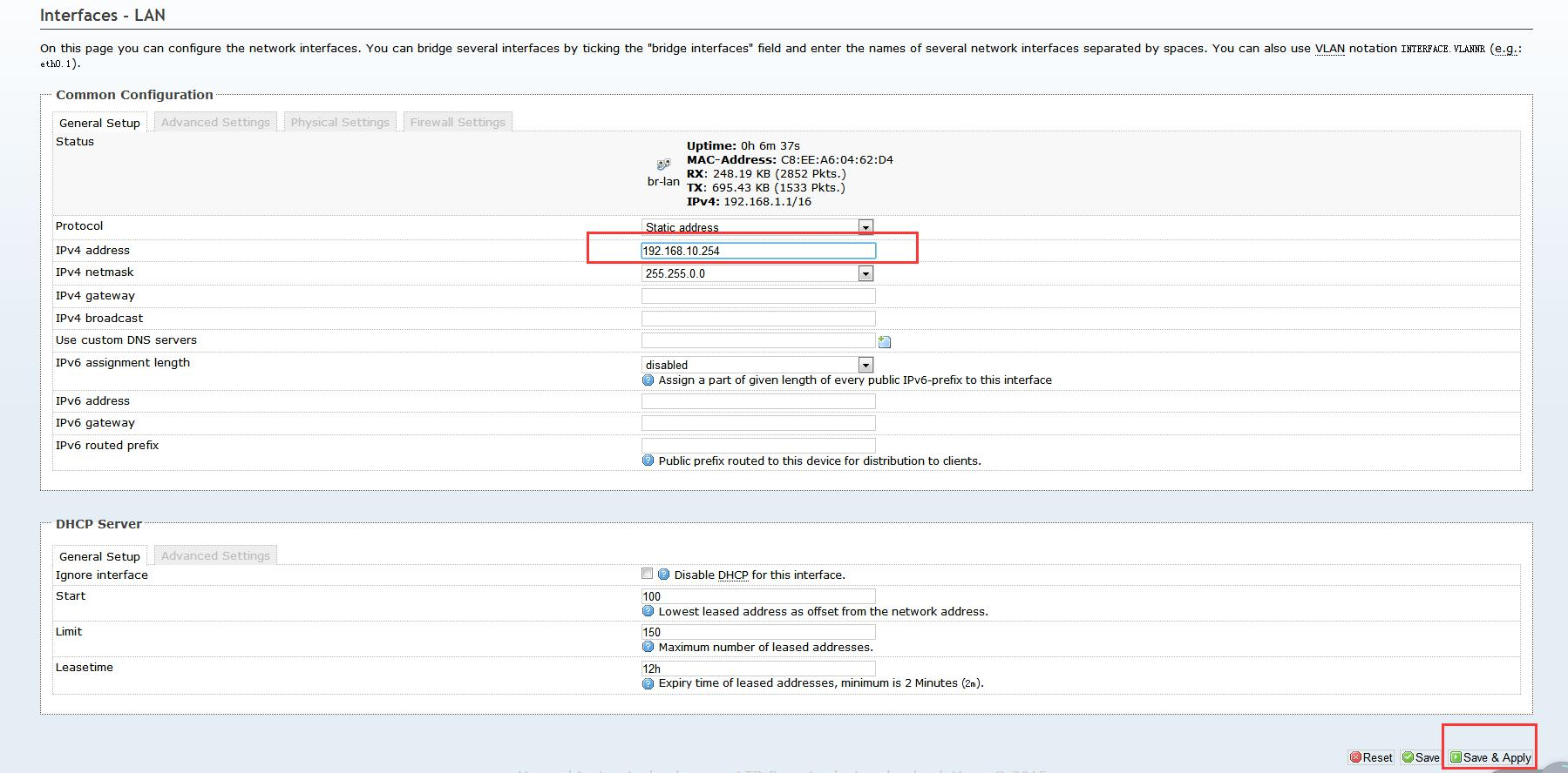 3.7 修改 IP 為 192.168.10.254 并點(diǎn)擊“Save&Apply”。(其他配置均不需要改變)