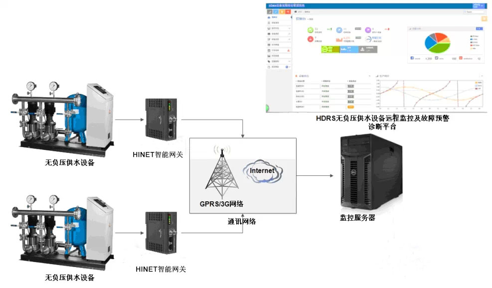 HDRS無負(fù)壓供水監(jiān)控預(yù)警系統(tǒng)由HINET智能網(wǎng)關(guān)、HDRS遠(yuǎn)程通信密鑰及HDRS供水監(jiān)控預(yù)警平臺(tái)組成。HINET智能網(wǎng)關(guān)作為HDRS供水監(jiān)控預(yù)警系統(tǒng)的數(shù)據(jù)采集端與變頻控制器中的核心控制器(如PLC)連接,將采集到的數(shù)據(jù)通過GPRS/3G/以太網(wǎng)等方式上傳至監(jiān)控服務(wù)器中,并通過HDRS無負(fù)壓供水監(jiān)控預(yù)警平臺(tái)強(qiáng)大的數(shù)據(jù)處理能力實(shí)現(xiàn)對(duì)無負(fù)壓供水設(shè)備的壓力、倒流、過流、變頻故障等信息的實(shí)時(shí)監(jiān)測(cè),同時(shí)實(shí)現(xiàn)超流量報(bào)警、進(jìn)壓過壓報(bào)警等報(bào)警動(dòng)作,并通過手機(jī)短信或郵件等方式通知設(shè)備管理員。